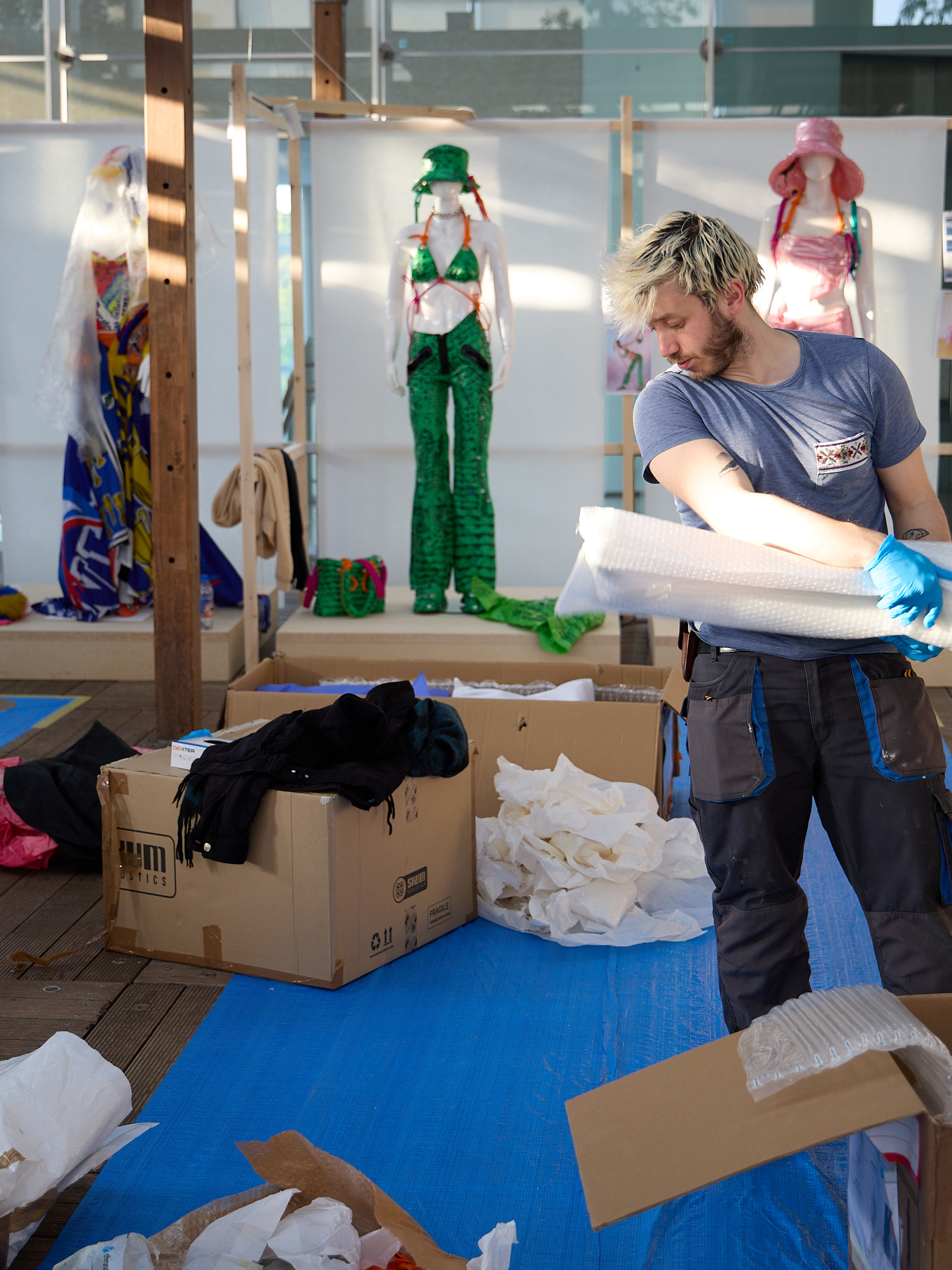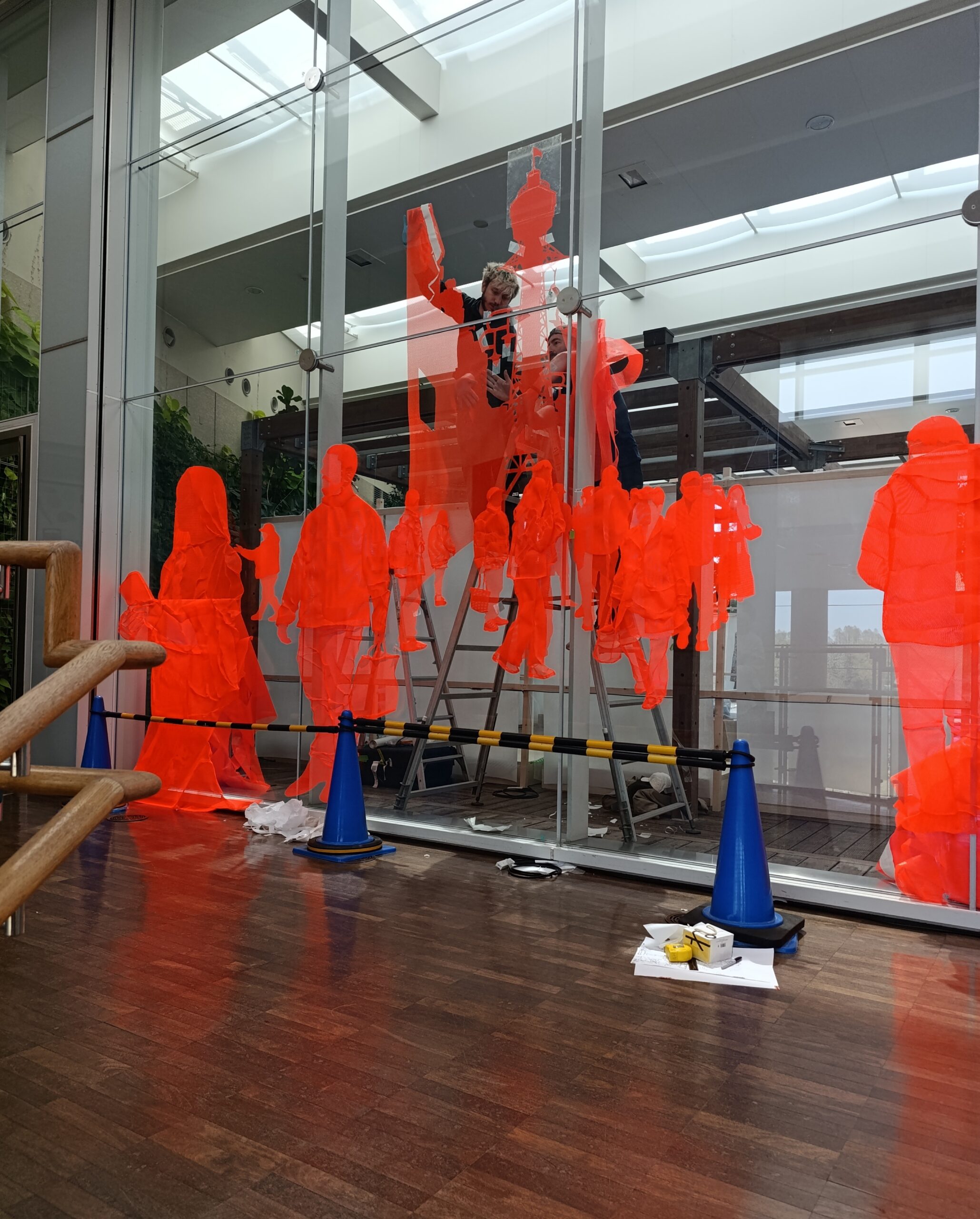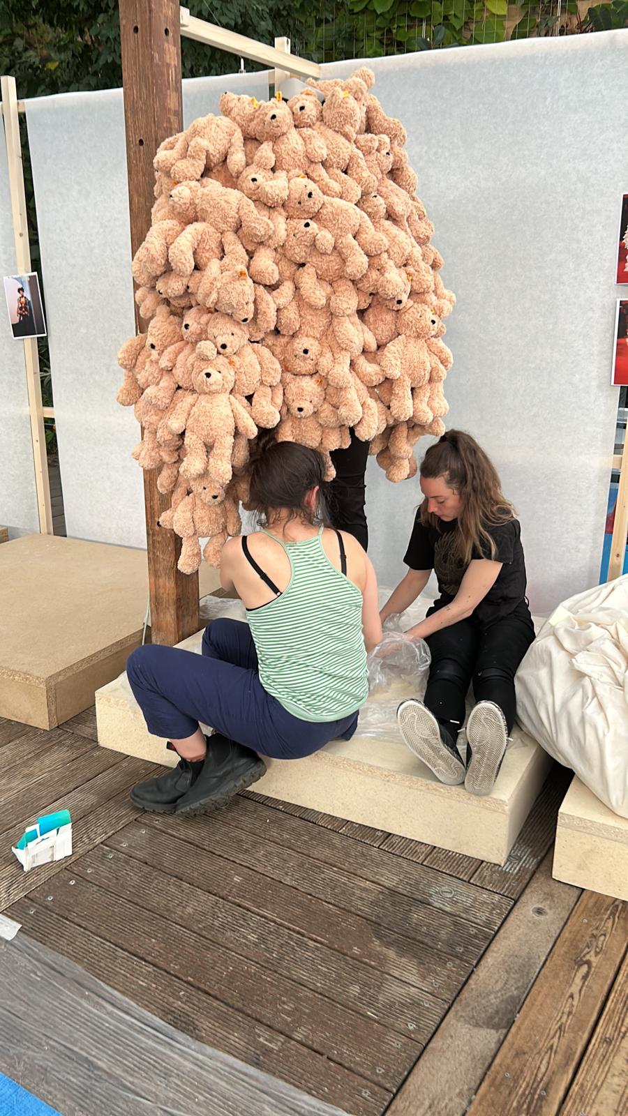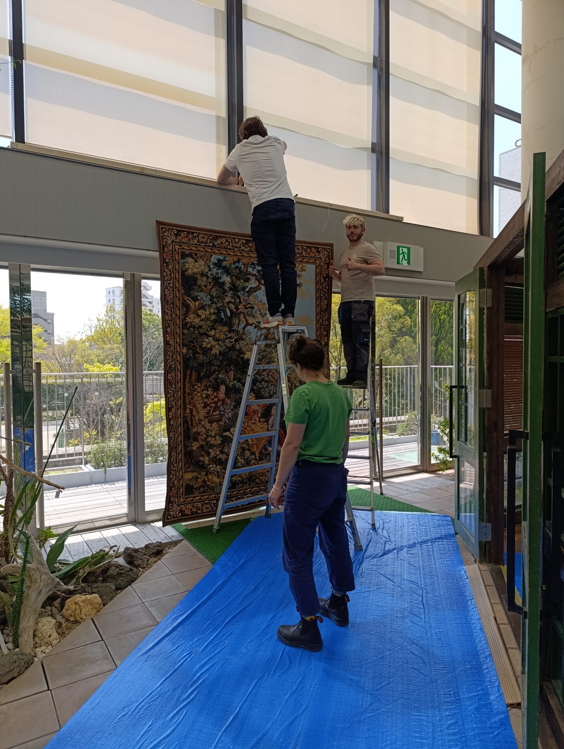 Recrutement d’une équipe réduite et experte, planification, anticipation des besoins en outils et matériaux, coordination avec le Nagai Park et les artistes, participation active au montage (scénographie, constats d’état, accrochage/décrochage). - Vie des équipes sur place :